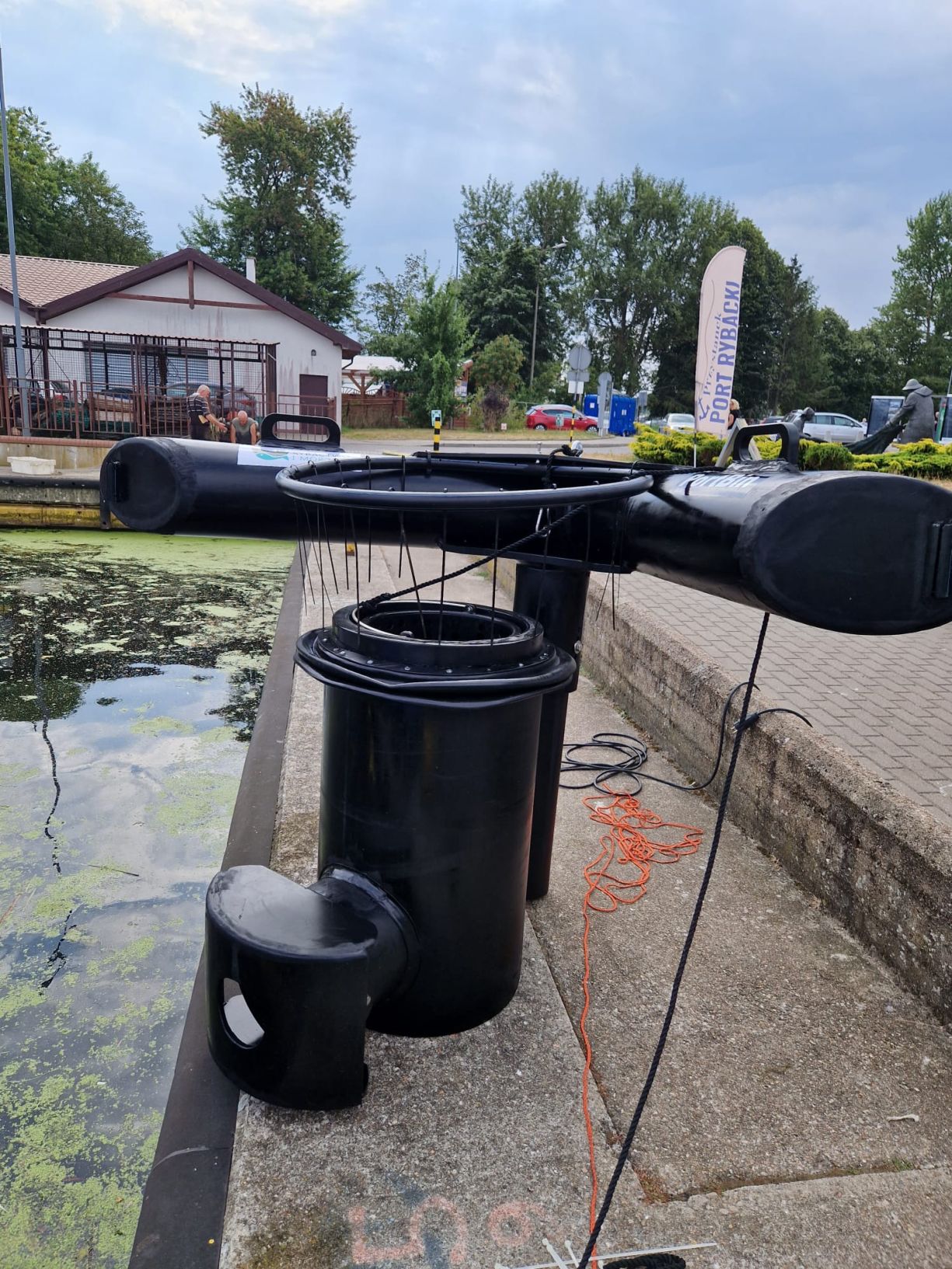 Drugi projekt pod nazwą “Zakup i montaż urządzeń czyszczących wody powierzchniowe w basenie portu rybackiego i jachtowego w Kołobrzegu”, wiązał się z zakupem i montażem systemu czyszczącego wodę powierzchniową w basenach portu jachtowego i rybackiego (urządzenie można przenosić w dowolne miejsce). Jest to urządzenie przechwytujące niewielkie odpady pływające, unoszące się na wodzie. Powierzchnia objęta działaniem urządzeń łącznie to około 16 400 m2. Zasięg urządzenia to promień 50 metrów, a pojemność torby śmietnikowej urządzenia to ok. 30 kg odpadów. Pomimo niewielkiego rozmiaru rocznie może zebrać do pół tony odpadów. Urządzenie zasilane jest przez małą 560-750 WATT-ową zatapialną pompę pod napięciem 220 V, a jego wymiary wynoszą 1,5mx1,5mx1,2 m. Kosz nie jest mocowany na sztywno do nabrzeża i swobodnie unosi się na wodzie. Łatwy szybki montaż i prosta obsługa ręczna pozwala jednej osobie nadzorować jego pracę. Efektem rzeczowym ma być redukcja części zanieczyszczeń unoszących się na wodzie w kołobrzeskim porcie. Dodatkowo, w ramach operacji zakupiona i posadowiona została w porcie rybackim przy ul. Szyprów 1 profesjonalna tablica informacyjna ze stali, poświęcona w całości opisowi parametrów, sposobu pracy i funkcjonowania urządzeń czyszczących wody powierzchniowe na akwenach otwartych i zamkniętych. Wszystkie teksty na tablicach są przetłumaczone na język angielski i niemiecki.